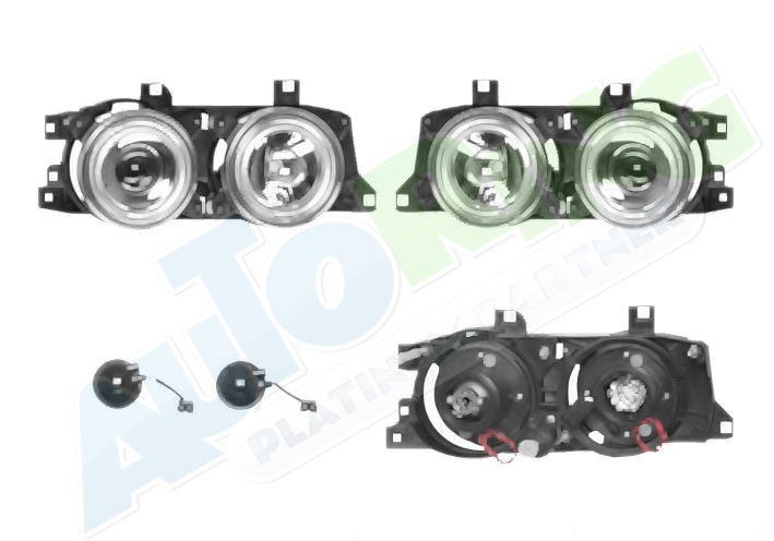 obrysové světlo připojené světlovodem, žárovka H1+H1, mechanické i elektrické naklápění, provedení transparentní + stříbrné, tuning