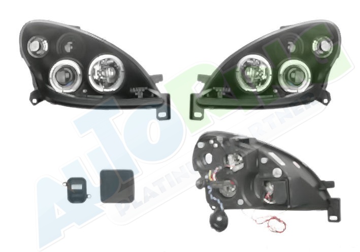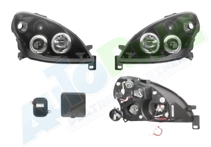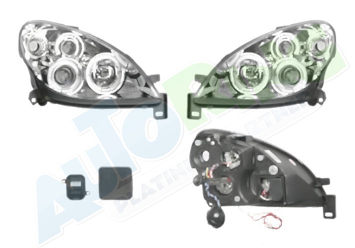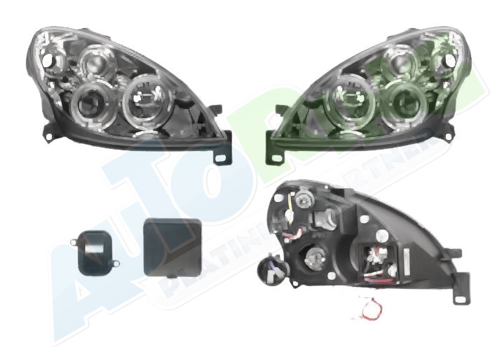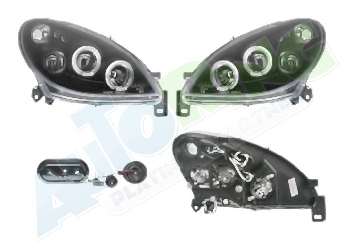 s mlhovým světlometem, obrysové světlo připojené světlovodem, žárovka H1+H1, elektrické naklápění, včetně servomotorku, provedení transparentní + černé, tuning