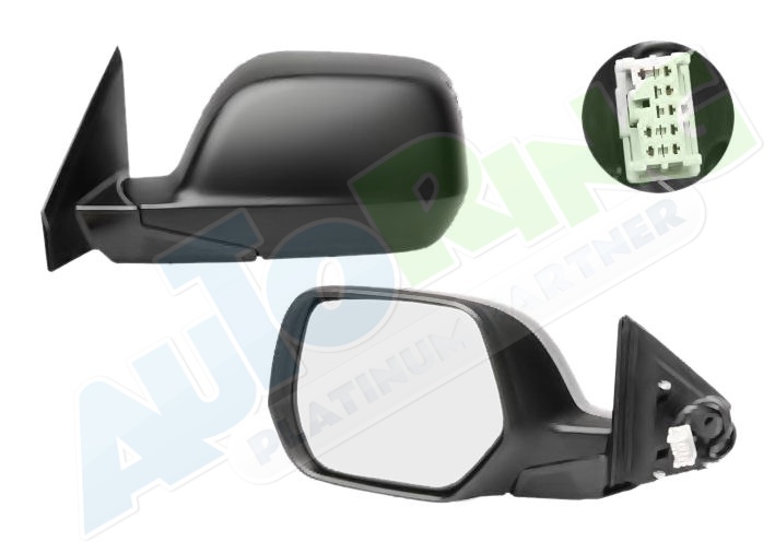 elektrické ovládání, černý kryt, vyhřívané, krycí sklo konvexní, krycí sklo v barevném provedení chromové (stříbrné)., sklopné