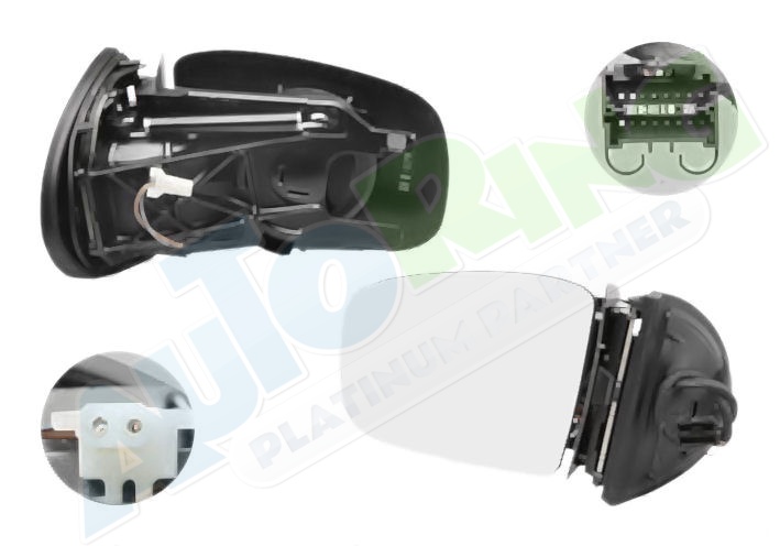 elektrické ovládání, bez krytu, vyhřívané, asférické krycí sklo, krycí sklo v barevném provedení chromové (stříbrné), sklopné, včetně paměti, konektor s 13 piny, s blinkrem