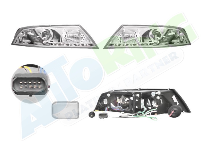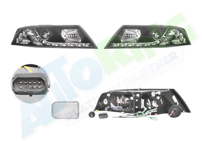 s LED obrysovým světlem, žárovka H1+H7, mechanické i elektrické naklápění, provedení transparentní + černé, tuning