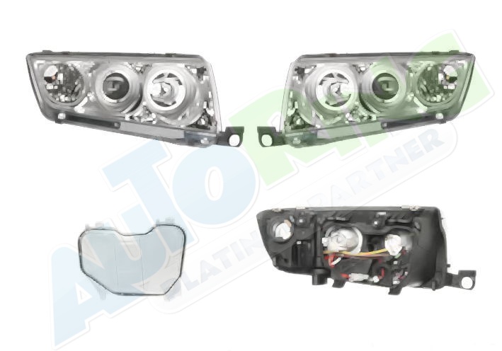 obrysové světlo připojené světlovodem, žárovka H1+H7, mechanické i elektrické naklápění, provedení transparentní + stříbrné, tuning