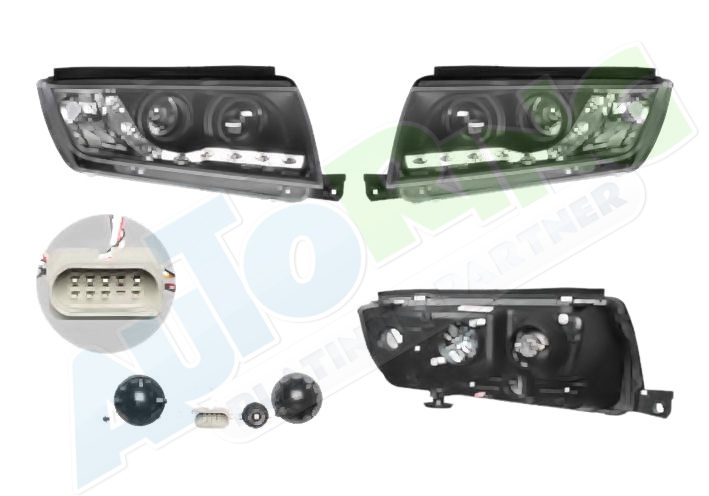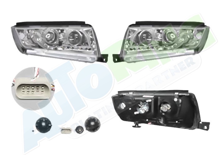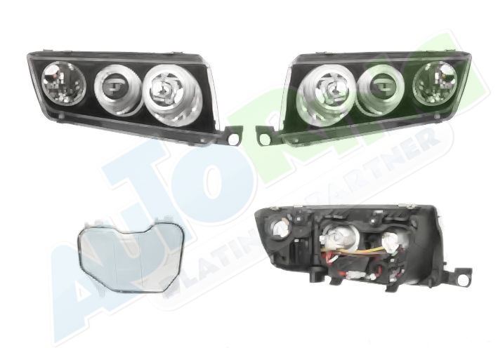 s LED obrysovým světlem, žárovka H1+H1, mechanické naklápění, provedení transparentní + černé, tuning
