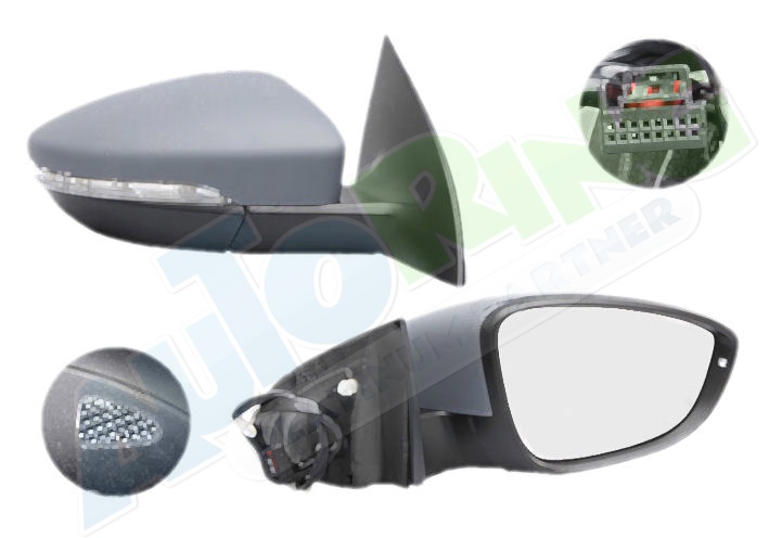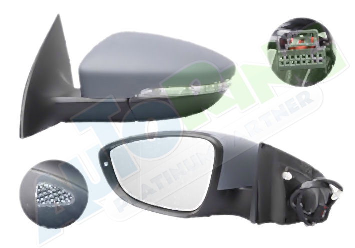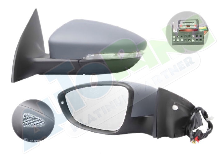 elektrické ovládání, částečně připraveno pro lakování, vyhřívané, krycí sklo asferické, krycí sklo v barevném provedení chromové (stříbrné)., sklopné, konektor s 9 piny, s blinkrem, se světlem s osvětlením prahu
