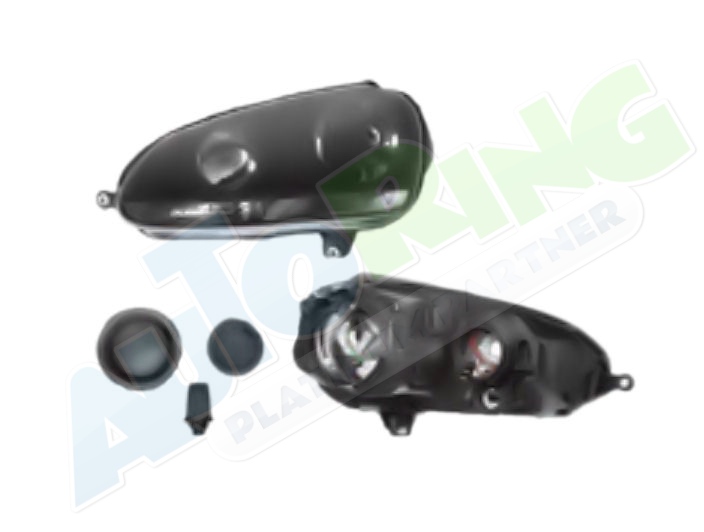 obrysové světlo připojené světlovodem, žárovka H1+H1, mechanické naklápění, provedení transparentní + černé, tuning
