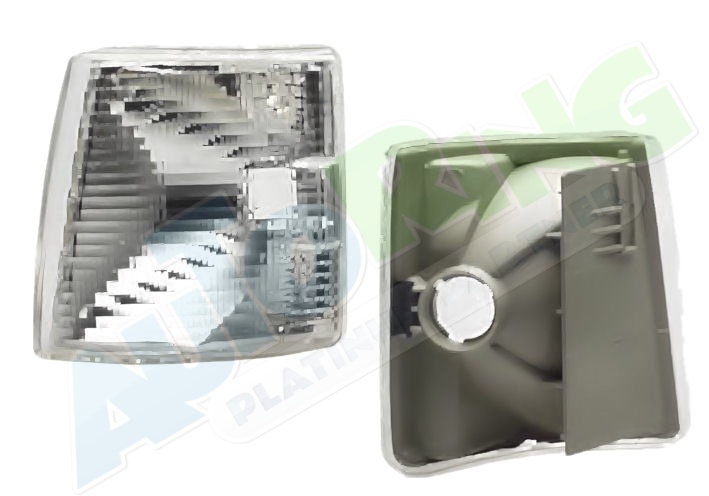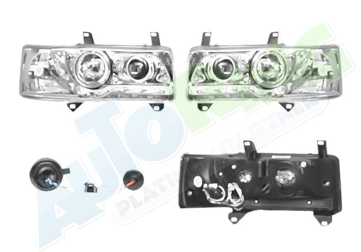 s LED obrysovým světlem, žárovka H1+H1, mechanické i elektrické naklápění, provedení transparentní + stříbrné, tuning