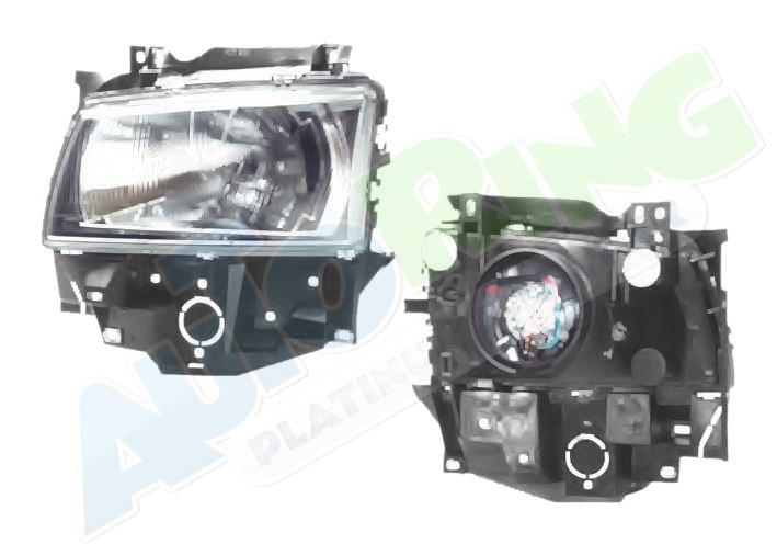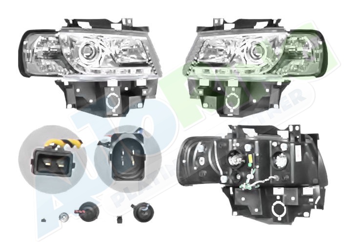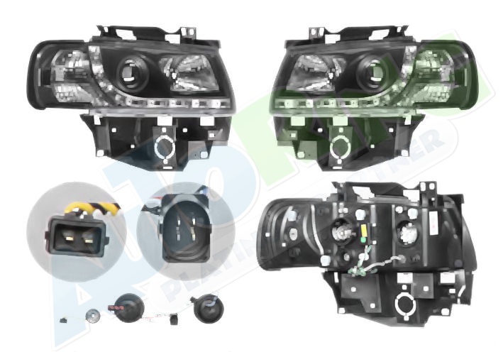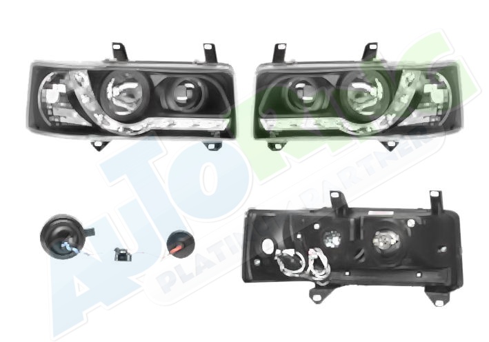 s LED obrysovým světlem, žárovka H1+H1, mechanické i elektrické naklápění, provedení transparentní + černé, tuning