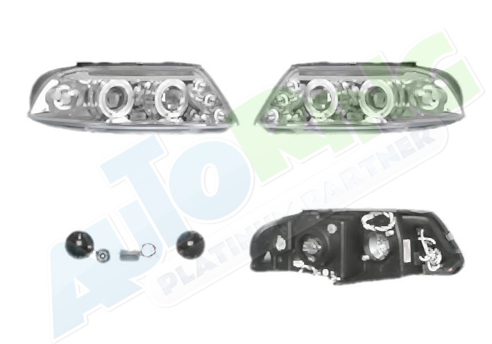 s LED obrysovým světlem, žárovka H1+H1, mechanické i elektrické naklápění, provedení transparentní + stříbrné, tuning