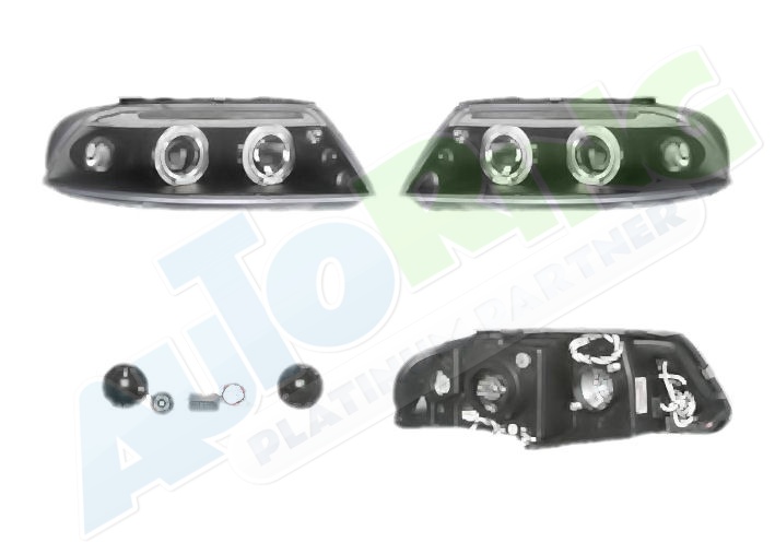 s LED obrysovým světlem, žárovka H1+H1, mechanické i elektrické naklápění, provedení transparentní + černé, tuning